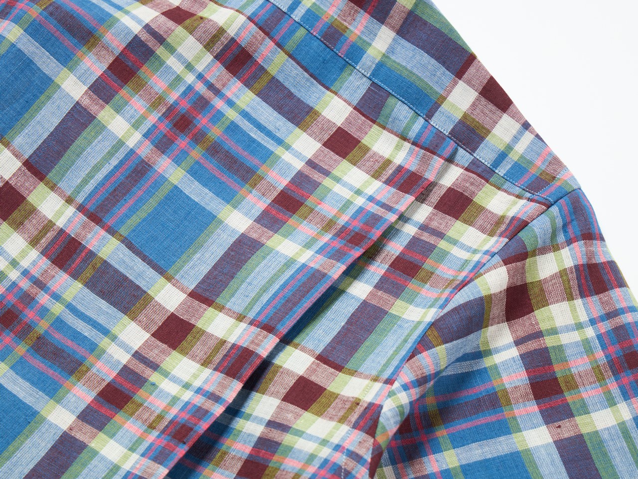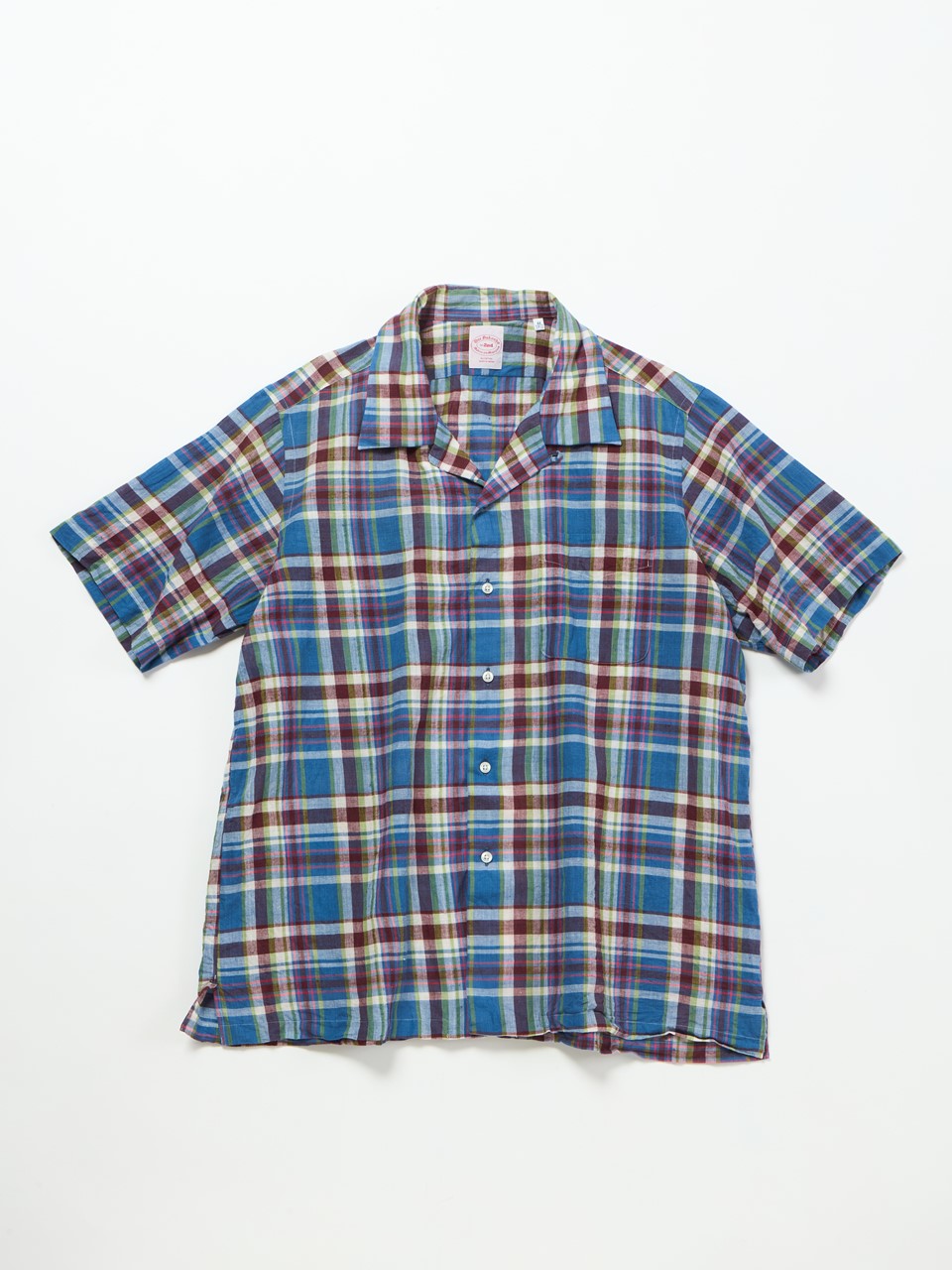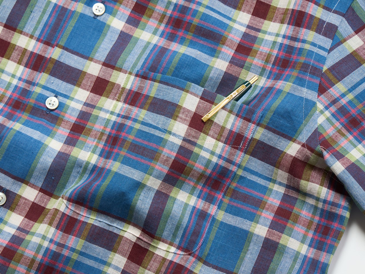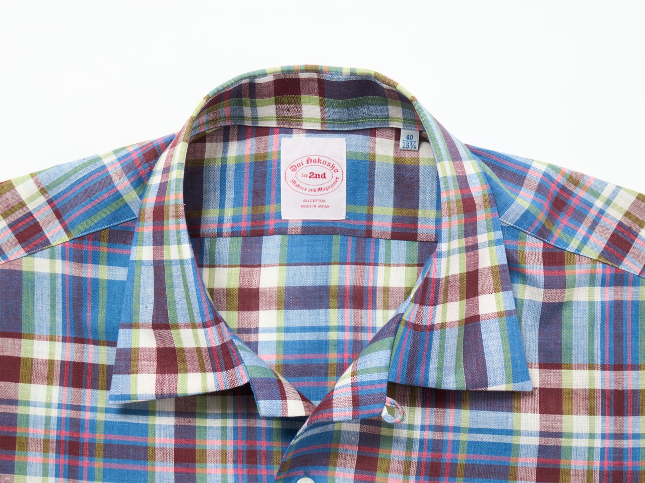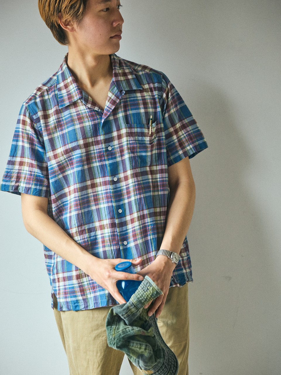 コラボ相手は過去にも2度にわたって別注させていただいた「土井縫工所」。1952年に創業した日本屈指のドレスシャツファクトリーで、細かいステッチや柄合わせ、美しいシルエットなどの高い縫製技術に定評のあるブランドです。今作をひと言で表すなら、「ドレスシャツメーカーの技術を駆使して作ったカジュアルなオープンカラーシャツ」。発色が強すぎず、落ち着いた印象のマドラスチェックは、1960年代頃のインドマドラスのような粗野な風合いをイメージしています。フィッティングは多少ゆとりをもたせつつも、極端にオーバーサイズではなく、スラックスと合わせても違和感の無いような品のあるパターンに仕上げました。