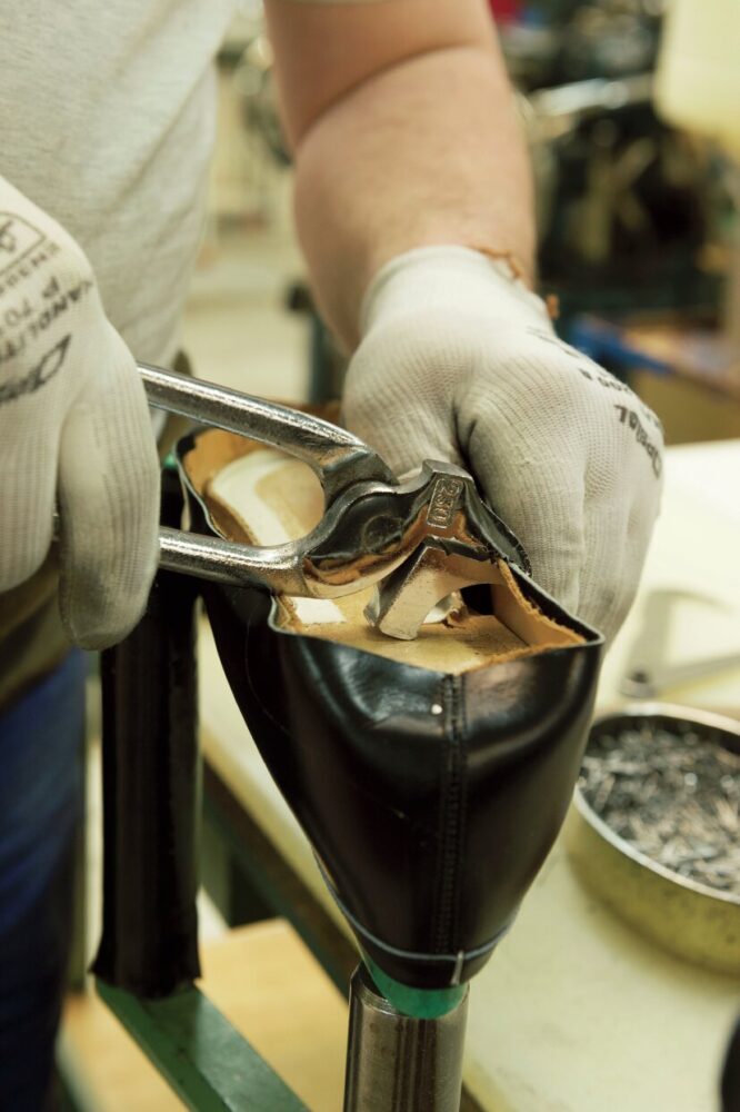 [シグニチャーローファー #180]の魅力として外せないのは履き込むごとに増す極上の履き心地。これは、グッドイヤー製法の過程で中底と本底の間に使用されるコルクが着用を重ねるごとに少しずつ沈み込み、中底の革も足の曲線に馴染むことで包み込むようなフィット感を得られるためだ。その履き心地の良さは、「もはやスリッパ感覚で履くことができる」という愛用者の声も挙がるほど。熟練の職人によるクラフトマンシップの賜物である。