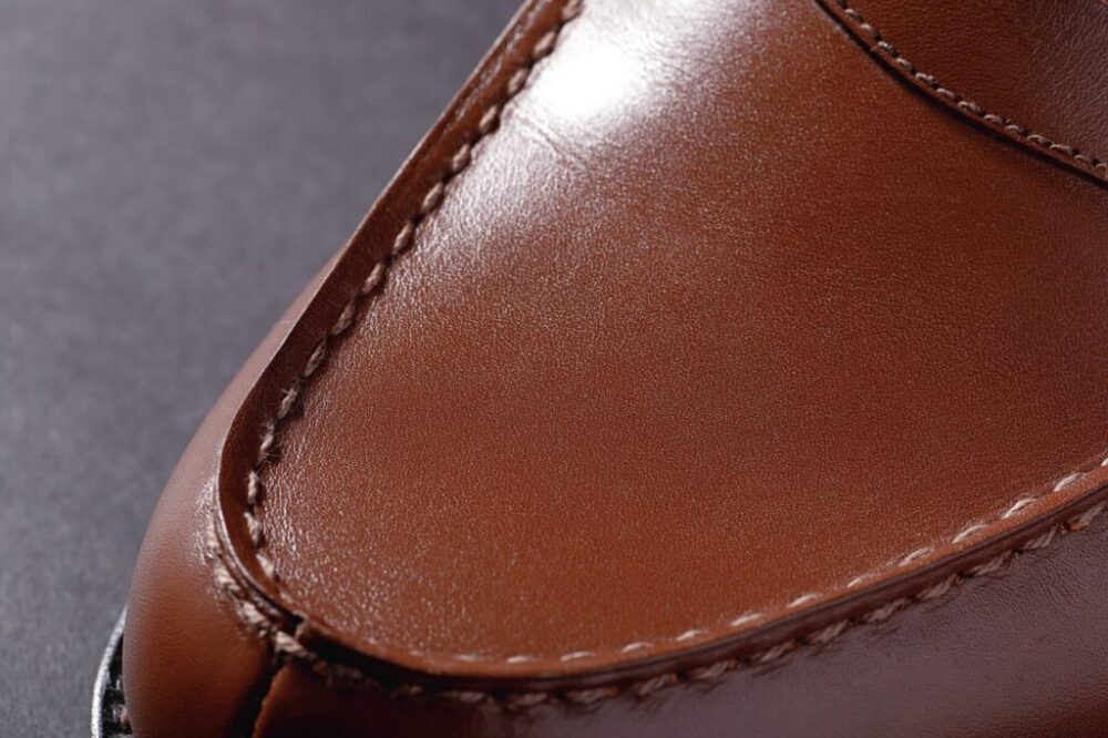 アッパーにはボックスカーフを採用。ボックスカーフとは生後6カ月以内の子牛の皮を鞣したカーフのなかでも最高級とされる素材で、きめ細かい表情と光沢が魅力。「革靴の品質は使用する革で決まる」というように素材選びにも妥協がないのが「ジェイエムウエストン」だ。この高品質のレザーを使用することで、前述のように履き込むことで得られるほかにはない極上の履き心地につながっている。