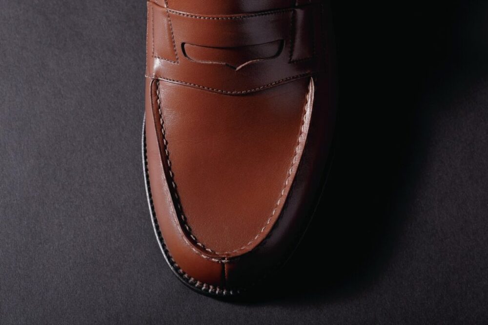 [シグニチャーローファー #180]のアイコニックなデザインとして挙げられるのがカモメ型のサドルの切れ込みだ。サドルの仕様は一般的なペニーローファーと同様のハーフサドルであるが、このキャッチーな切れ込みのデザインも同モデルが人気を博す理由のひとつとなっている。ほかにもノーズとタンの長さのバランスや程よく張り出したコバ、丁寧なモカ縫いなどデザイン的な魅力が随所に感じられる。