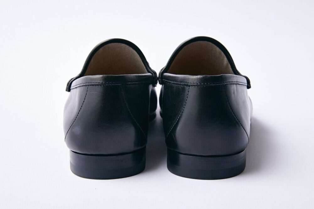 ハの字に入るヒール部分のステッチが特徴。これらのステッチは役割分担がなされた熟練の職人による手作業によって施されている。ヒールにかけての絞り込みは少なく、着脱が容易なのも◎。