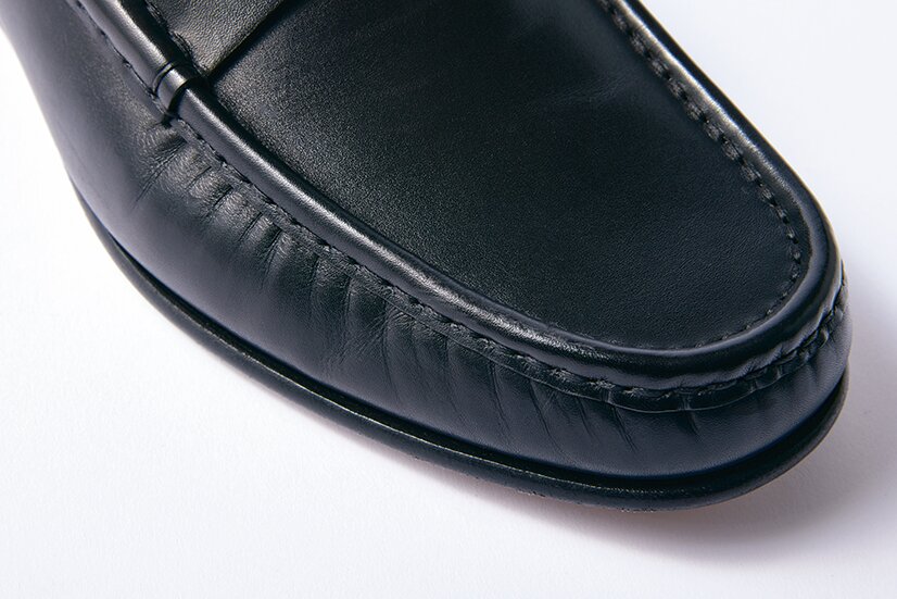 ローファーの顔とも言えるモカはハンドステッチによるもの。柔らかな履き心地の実現にひと役買っている。