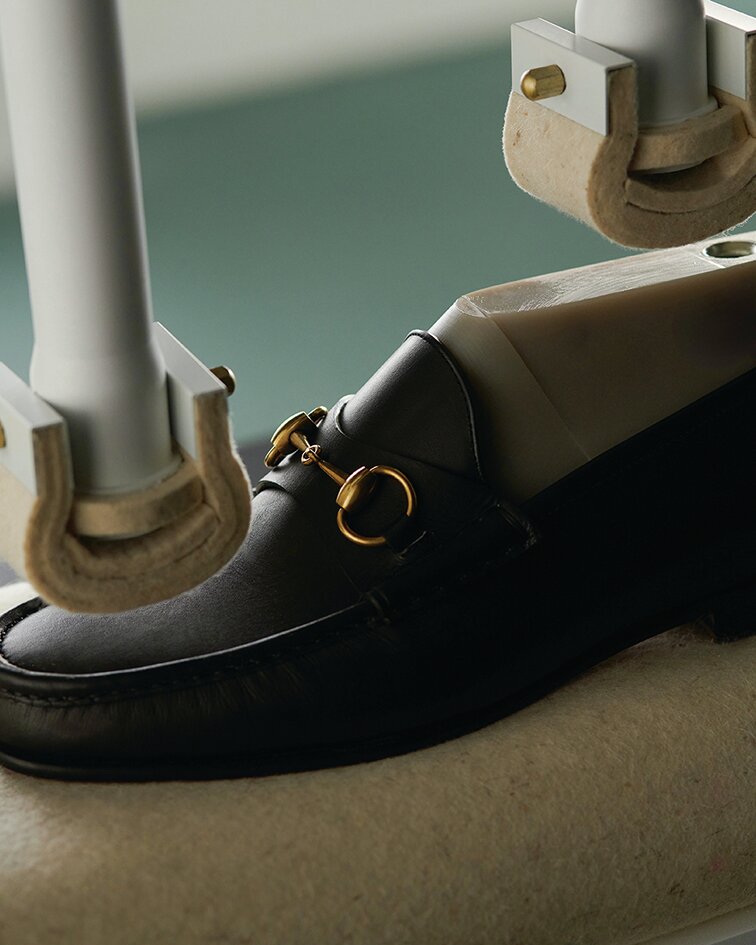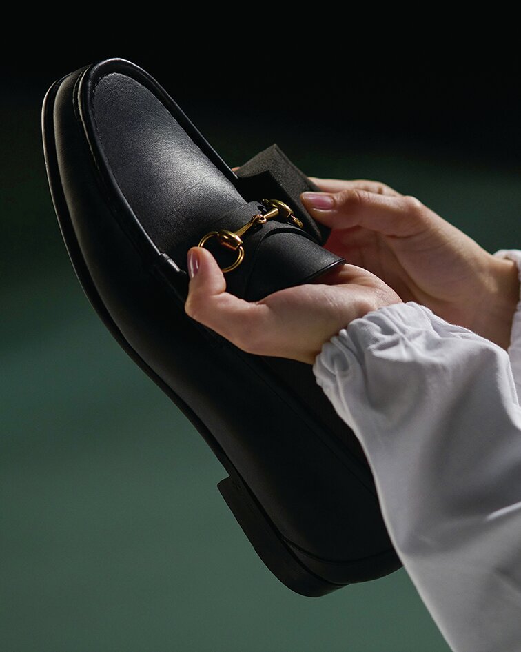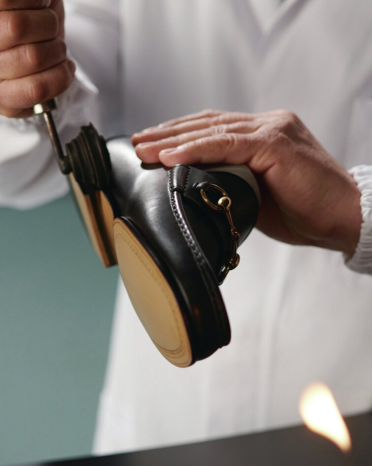 また、コバ部分を手作業で磨き上げることで丸く削り落とし、全体としての柔らかなムードを演出。これらの手作業によって、革靴好きであれば誰もが憧れる[ホースビット 1953]は誕生するのだ「グッチ」のアイデンティティともいえるゴールドに輝くビットの磨きも手作業で行うなど、これらの写真を見ればクラフトマンシップが存分に感じられる。