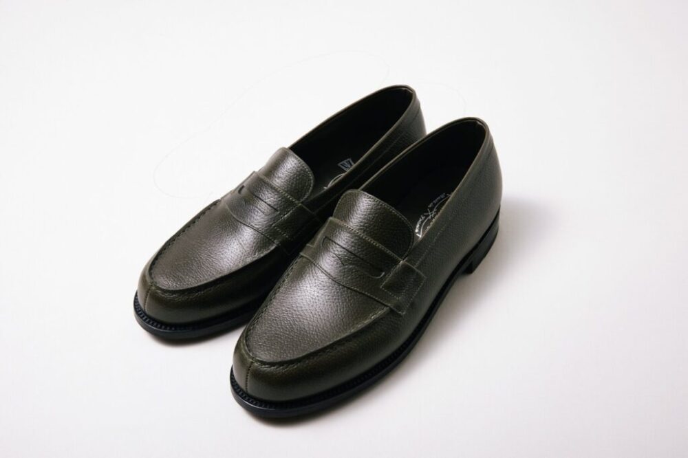 シグニチャーローファー[#180]を、表情のあるグレインレザーでオーダー。グリーンのほか、ネイビーも展開しており、インソールやライニングを同色にすることで靴自体の印象をすっきりと仕上げた別注モデル。黒のアウトソールと相まってカジュアルな中に程よく品の良い印象に。(ユナイテッドアローズ 六本木ヒルズ店 TEL050-8893-421)