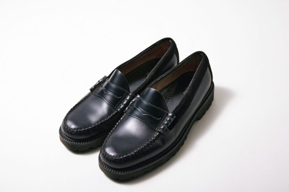 「ジーエイチバス」の定番モデル[ラーソン]は、サドル部の両端をステッチで巻き縫いした「ビーフロール」が特徴。そのカジュアルなボリュームをさらに押し出すべく、凹凸のあるラグを備え、コバも張り出した厚みのあるアウトソールを組み合わせた。履き口のスウェード使いも武骨(ジャーナルスタンダード 表参道TEL03‐6418‐7961)