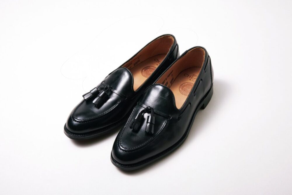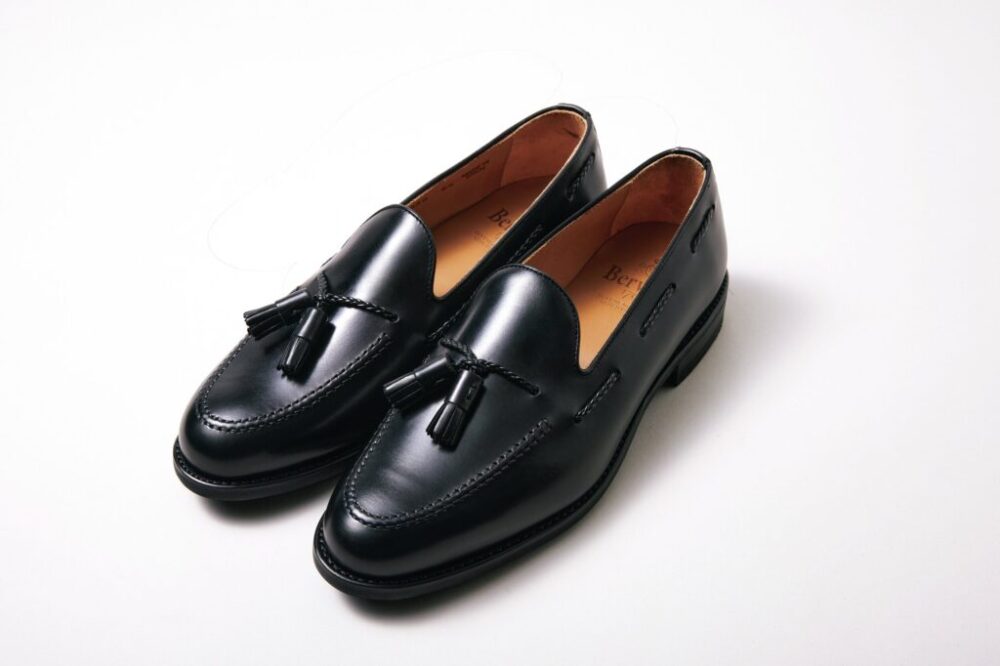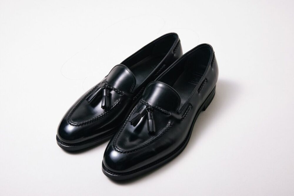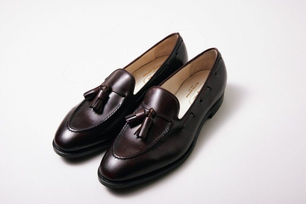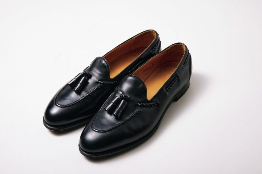 ペニーローファーと同じく、シャープなエッグトゥが特徴的な「184ラスト」を採用したタッセルローファー[ベルグラヴィア]。デラプレと呼ばれる光沢感のあるオイルレザーがエレガントな印象。スマートなボリューム感にカッティングされたタッセルや、ぐるりと一周する紐飾りの美しい編み込みがラグジュアリーで、さすがは名門の1足と言ったところか。均一に縫われたすくいモカや、ヒール部分のつまみ縫いなど、細部にも卓越した職人技が。写真のモデルではやや幅広のEウィズを採用。そのためつま先部分の捨て寸を控えた小さめのフィッティングをするのが英国靴フリークのあいだでは粋とされる。足に馴染むまで大切に履き続けたい。(ストラスブルゴ カスタマーセンターTEL0120-383-563)