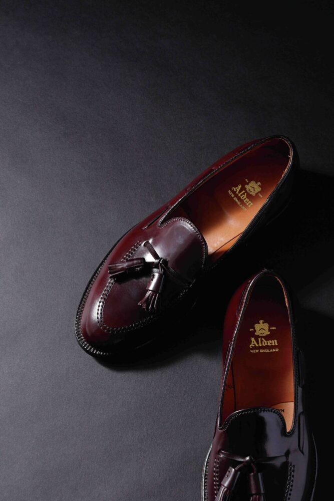 “革靴の王様”としてその名を知らしめる「オールデン」を代表するモデルのひとつ。世界トップクラスのコードバンを作り出すホーウィン社のシェルコードバンのバーガンディ(#8)を採用し、コードバン特有の眩い光沢や極上の経年変化を楽しむことができる。コルクをたっぷりと使用することで履くごとに着用者の足型へと沈み込むという機能性や、タッセルを邪魔しないためにあえてマシンステッチがなされたモカ縫いなど、その魅力を挙げればキリがない。20万9000円(ラコタTEL03-3545-3322)