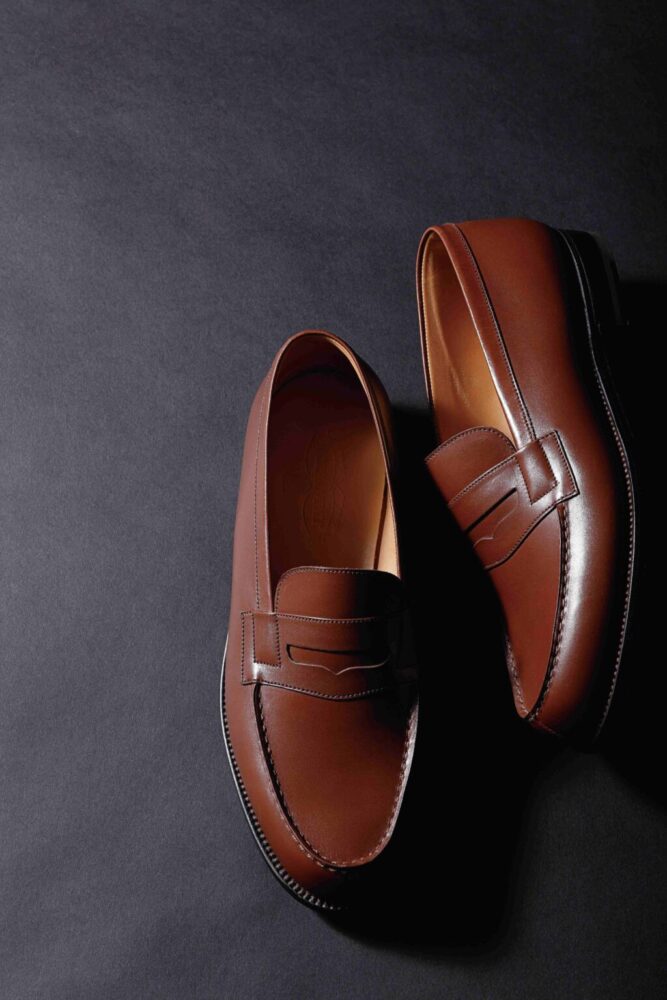 最高級のボックスカーフを使用し、丁寧なモカ縫いやショートノーズのやや小ぶりなシルエット、そして履き込むことによって得られる履き心地の良さなどその魅力を挙げればキリのない「ジェイエムウエストン」のアイコン的なペニーローファー。フランス中部に位置するリモージュの自社工場にて熟練の職人による約180もの工程を経て完成される凛とした佇まいは、“ローファーの完成系”としての呼び声高く、あらゆるスタイルにマッチする。15万6200円(ジェイエムウエストン 青山店TEL03-6805-1691)