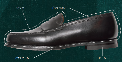 まずはキホンのキ。ローファーの各パーツの名称をおさらいする。もっともベーシックな形であるペニーローファーを見本とする。