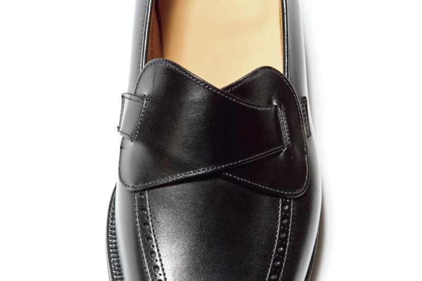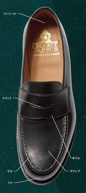 まずローファーらしいディテールとして覚えておきたいのが、甲に乗せた帯状のパーツで、これを「サドル」という。ペニータイプの場合、ここに切り込みが入っていることがほとんどで、これは「スリット」と呼ばれる。そして「モカ」も必修ワード。ローファー最大の特長のひとつで、甲(ヴァンプ)からつま先を走るU字型のステッチのこと。モカの縫い方にもいくつか種類がある。