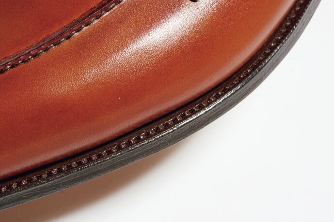 アッパーと本底が直接縫われていない点が最大のポイント。アッパーに縫い付けられるのはあくまでウェルトで、このウェルトが本底と縫い付けられる。ウェルトのぶんだけコバの張り出しが大きい。厚みが増すためクッション性に優れ、他の製法よりも多少雨に強い