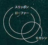 「結論から言うと、図のようにスリッポンという大分類に、ローファーという中分類が含まれているイメージです。昔はローファーと言うとペニーだけの印象でしたが、定義が広くなっていますね。“モカシン”もややこしいですが本来甲部分だけが別の革で縫い合わされ、他の部分は一枚革になっている袋状の作りのことを指します。逆に言えば『クラークス』の[ワラビー]など、紐靴にもモカシンは存在します」