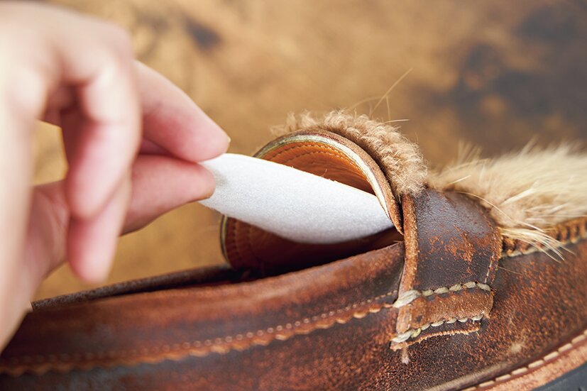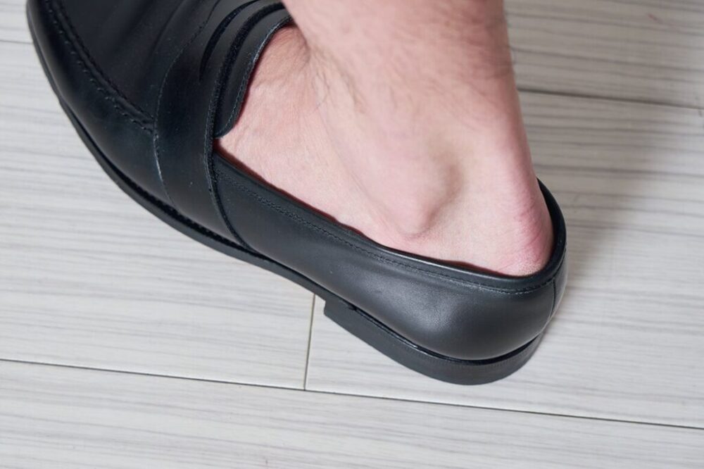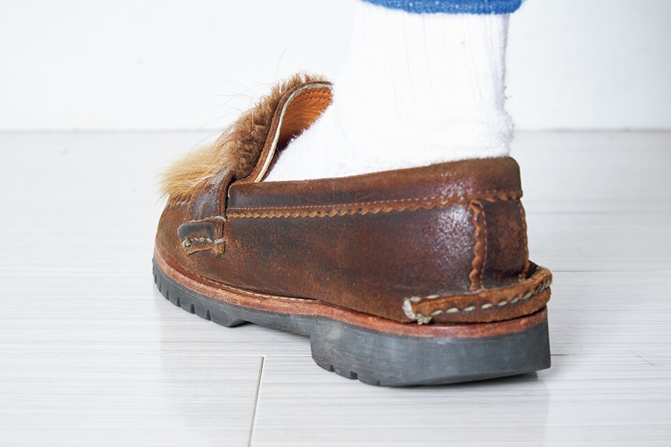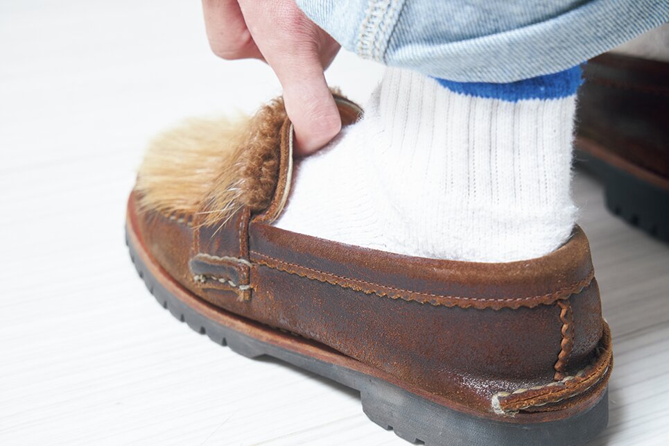 足の甲の部分はワイズ、高さともにぴったりで調整の余地はなさそうだが、カカトだけが抜けてしまう。そのため今回はカカト部分にパッドを仕込み縦のサイズ調整を行う。これがうまくいけば、ちゃんとした初ローファー。