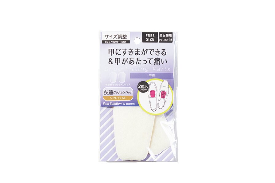 つま先インソールで足りないのならば、シュータンの裏側に貼るパッドを追加する。こちらもテープで甲の部分に貼り付ける。足に当たる部分にはクッションが入っており、快適に着用が可能だ。