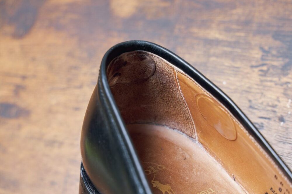 貼ったカカト部分を見てみると、透明なパッドがうまく馴染み、靴を脱いだ際にもあまり気にならない。もし、調整の跡が気になる方は透明がオススメ。