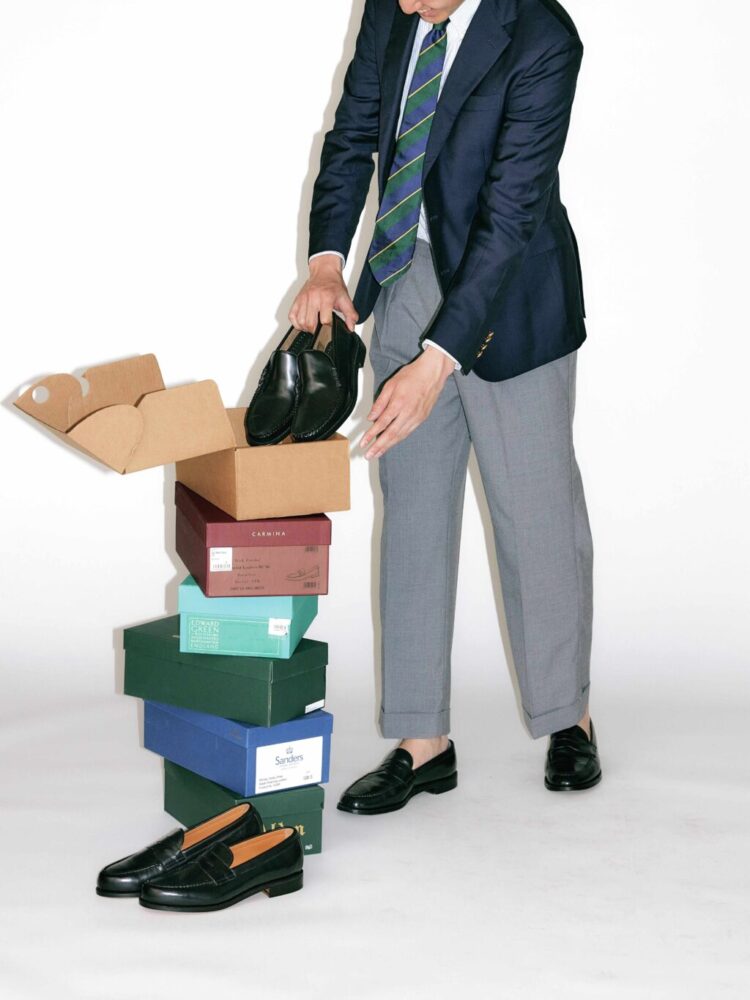 アメトラの定番パンツの中でも最もドレッシーなグレーのトラウザーズにはこちらも最もドレッシーなブラックを合わせるのが無難だ。パンツがドレッシーな分、ローファーのデザインの中でもややドレッシーなタッセルやビットとも難なく合わせられる。ワタリや裾の幅がやや細いものにはボリュームの少ないローファーを合わせるとなおよし。