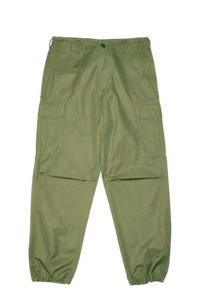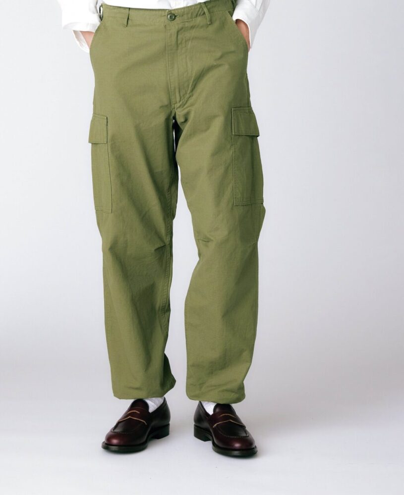 ‘60sの通称“ジャングルファティーグ”がモチーフ。当時のリップストップポプリンを徹底分析し、素材から開発。細番手でしっかりと打ち込まれたリップストップ生地は頑丈で光沢があり、経年変化も楽しみだ。男らしい茶芯のバーガンディが武骨なミリタリーパンツと好相性。2万6400円(ベースデニムプロダクツTEL0798-74-8106)