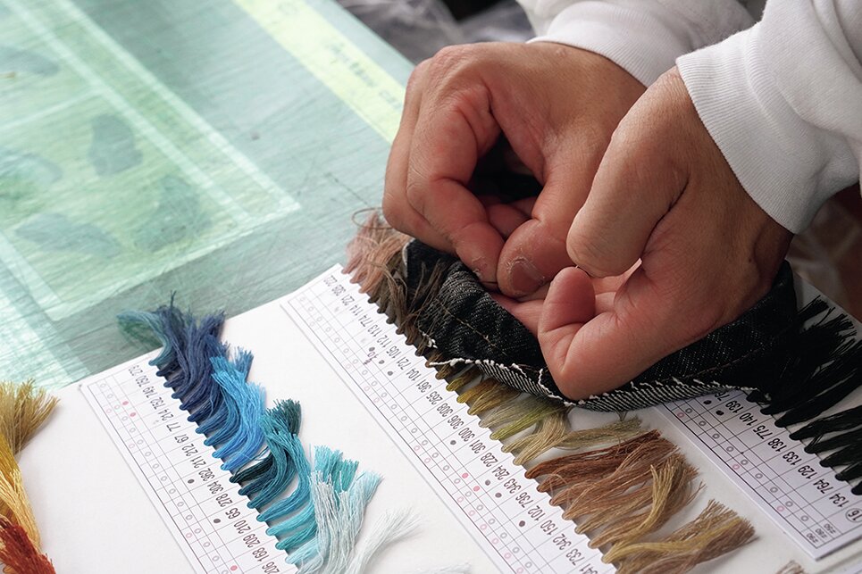 デニムに使われている糸の色をよく見て、使用する糸を選んでいく。選ぶ糸を間違えると、縫い上がりにかなりの差が出るので注意が必要だ。