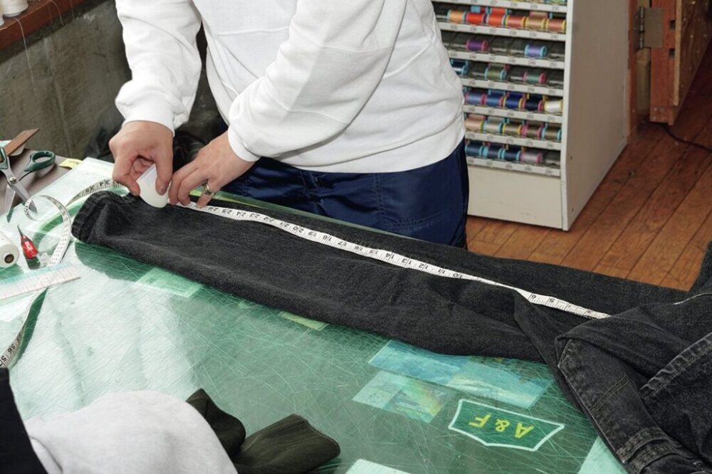 股下を測り裾上げする長さを決める。デニムは特に生地のねじれがあるため股下を測り、地の目に平行となるように仕上げ線を引く。