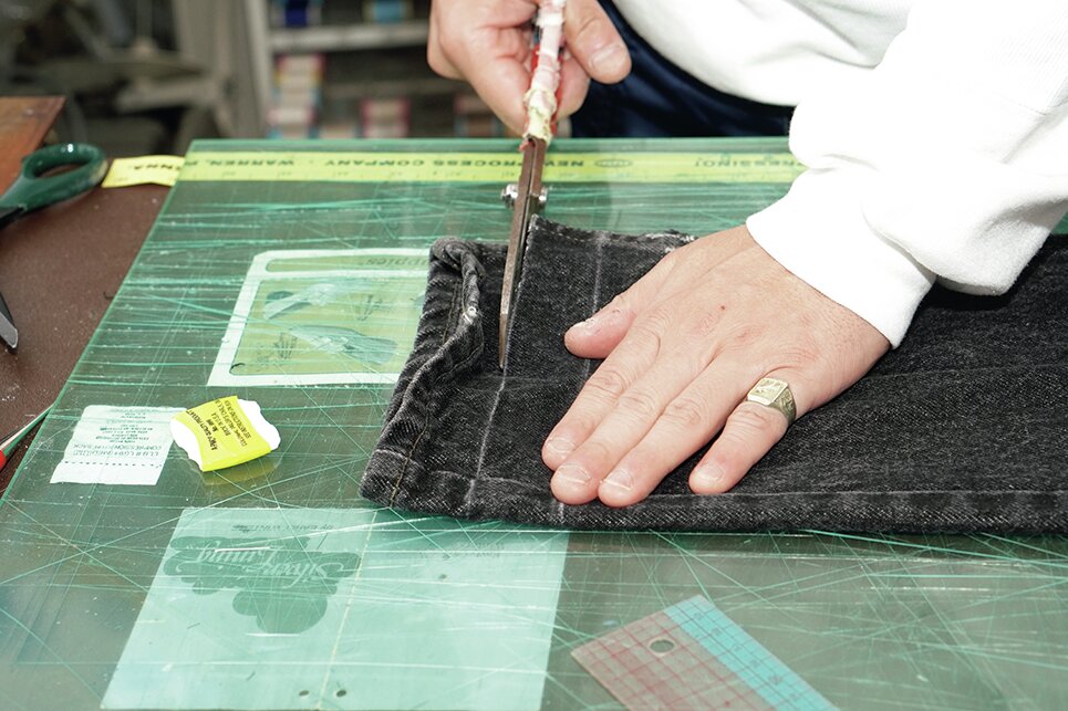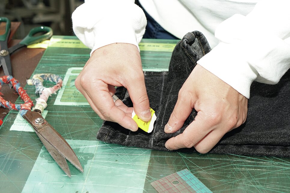 先ほど引いた仕上げ線よりも、デニムであれば縫い代を3cmをとりハサミでカットしていく。古着は特に縮みやねじれがあるため、慎重に。