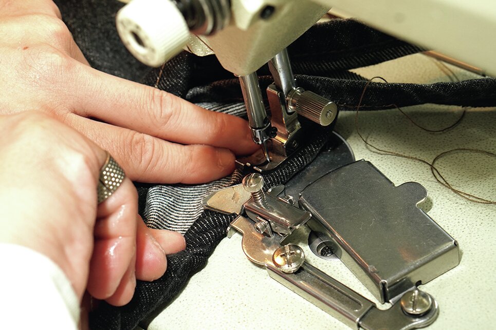 仕上げ線の長さになるように、3cmの縫い代を1.5cmずつの二つ折りに。生地のねじれを再現するため、右手でねじりながら縫っていく。