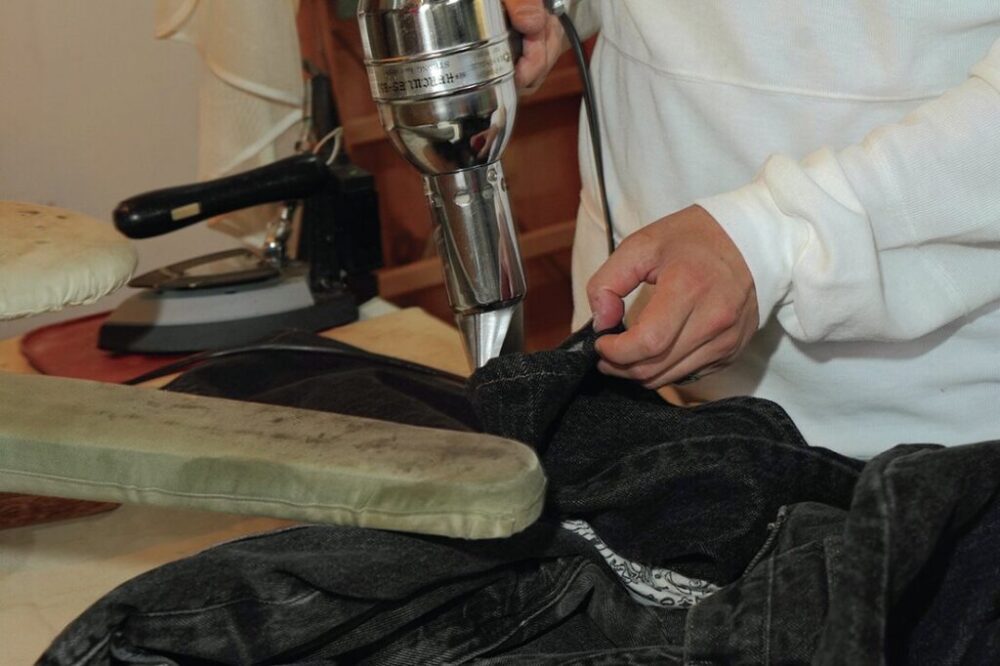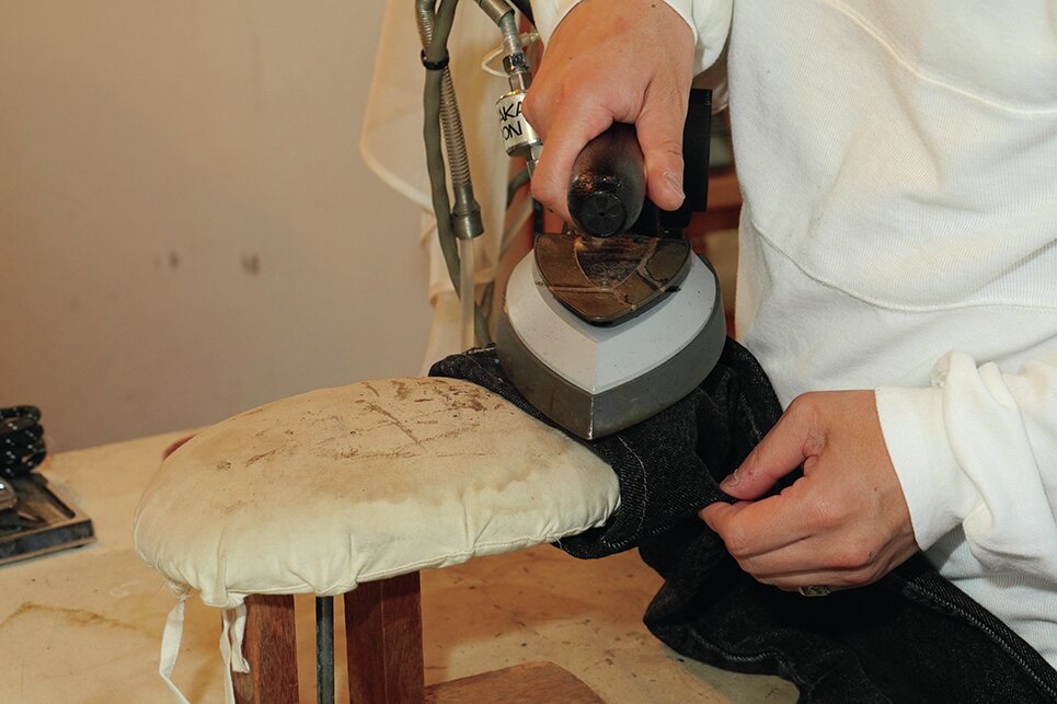 縫い上がった後に、高温の蒸気アイロンを当てる。コットンの生地は蒸気が当たることで縮みが生まれ、縫った際のねじれがより際立つ。