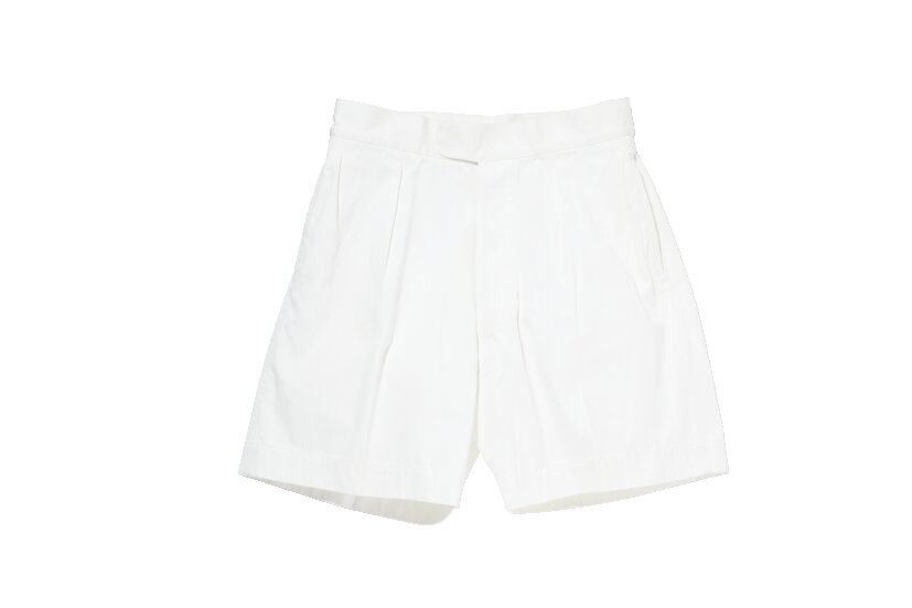 ❸しっかり光沢感のあるコットンツイルのショーツ。「このハリ感であれば、ブレザースタイルに合いそう」
