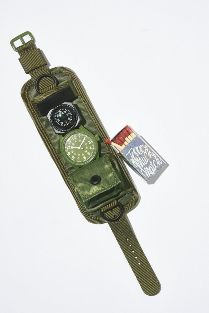 アンティークウォッチの雰囲気を手軽に楽しめる腕時計ブランド「ヴァーグウォッチカンパニー」から、ゆっくりと自分と向き合うための遊び心を詰め込んだ腕時計[トゥーマッチ]をご紹介。リストバンドのように広がる台座には、極小サイズのマッチを忍ばせるポケットや上下のDカン、フィールドコンパスや存在感のあるタグなど、“過度”なギミックが満載だ。台座を手がけたのは東京のバッグブランド「スピークイージー」。道具としての機能はもちろん、ファッション性を兼ね備え、無駄にも見える行為をあえて大切にしたいという思いが色濃く反映された1本に仕上がっている。目まぐるしい速さで流れる現代だからこそ、煙草をくゆらせるひとときや、静かに思いを巡らす時間を尊重する。この時計を装うことで「無駄」と思われる贅沢を楽しむ、そんな特別を味わっていただきたい。3万9600円(ヨシダトレードカンパニーTEL03-5774-9042)