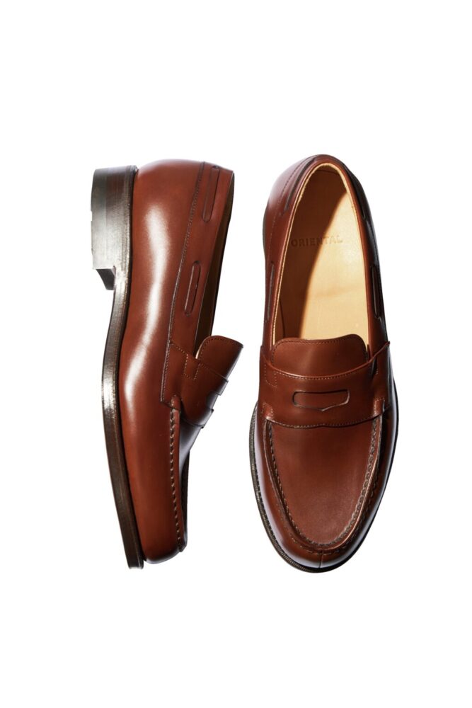 クラシックからモダンなスタイルまで幅広く提案し、「革靴を日常に」をコンセプトに掲げる「オリエンタル」は、1947年創業の靴メーカー「オリエンタルシューズ」が2016年に始動したオリジナルブランド。こちらの[#560 ローファー]は、トゥのセンターシーム、履き口のテープが絶妙なアクセントを生み、世界有数のタンナーが仕上げたヨーロッパ産ボックスカーフのきめ細やかなアッパーと、レザーダブルソールの重厚感が好相性だ。指まわりをゆったり確保しつつ甲を低めに絞る設計により、華奢な足でもサイズダウン不要なのが嬉しい。ラストのボリュームを活かしたバランスの良いフォルムが、クラシックにも現代的なスタイルにも寄り添い、スーツからデニムまで幅広く馴染む。また、グッドイヤーウェルト製法による堅牢性を兼ね備え、長く愛用できる1足となっている。7万1500円(オリエンタルシューズTEL0743-55-1113)