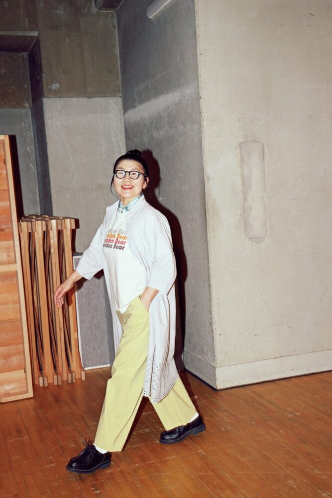 小すみ先生の普段着の写真をいくつか拝見したところ、着物姿とはギャップのあるカジュアルな装いもとても似合っていらっしゃいました。小すみ先生のそんな一面を見てみたくて、インナーには思い切りカジュアルな、アメカジ風のTシャツを取り入れています。裾に可愛らしい模様が施されたロングシャツと、華やかな色味のガウチョパンツで女性らしさも忘れません。首の巻き物はアウターと色味を合わせつつ、あえてTシャツのなかに入れてさりげなく。