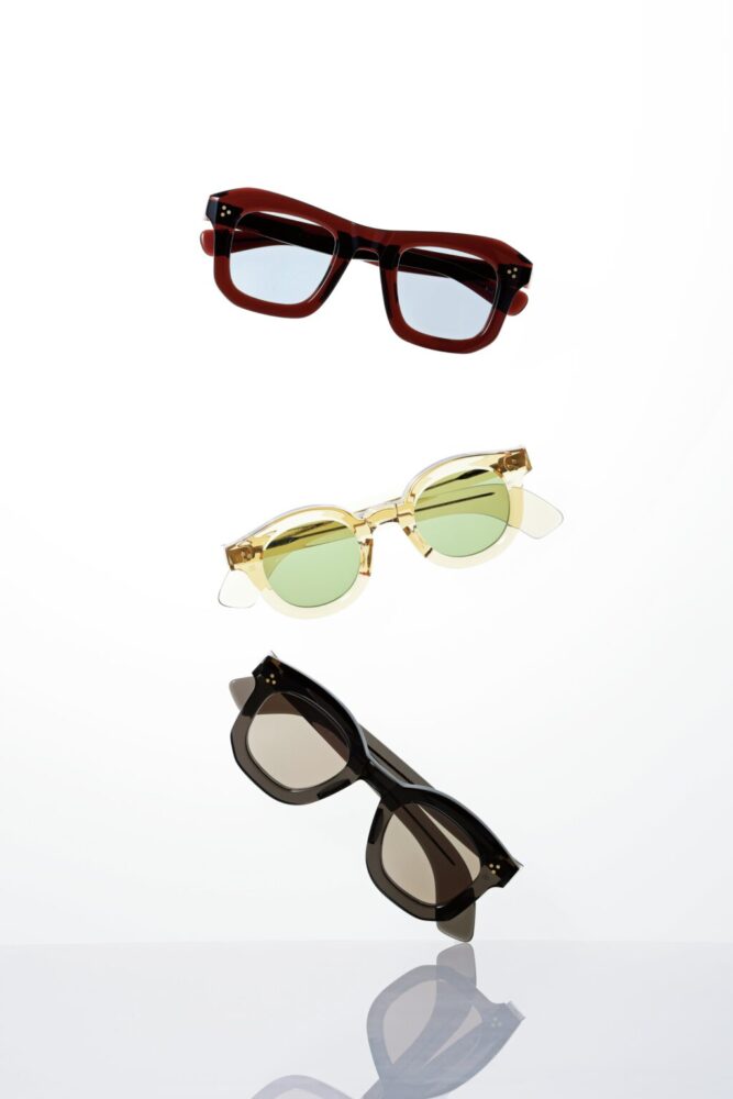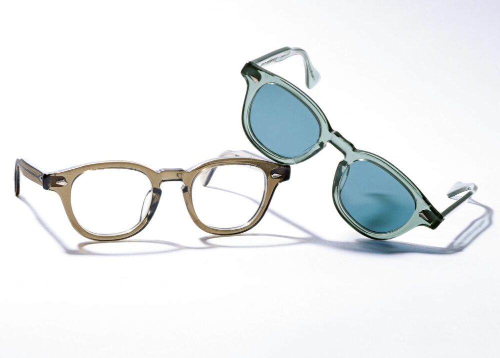 名作[AR]をベースに、2店舗それぞれがカラー別注を依頼。いずれも抜け感のあるクリアフレームで、再生産のオリーブ、新発売のグレイッシュグリーンと、各店らしい絶妙なニュアンスカラー。別注ならではのモダンな佇まいが新鮮な[AR]に。