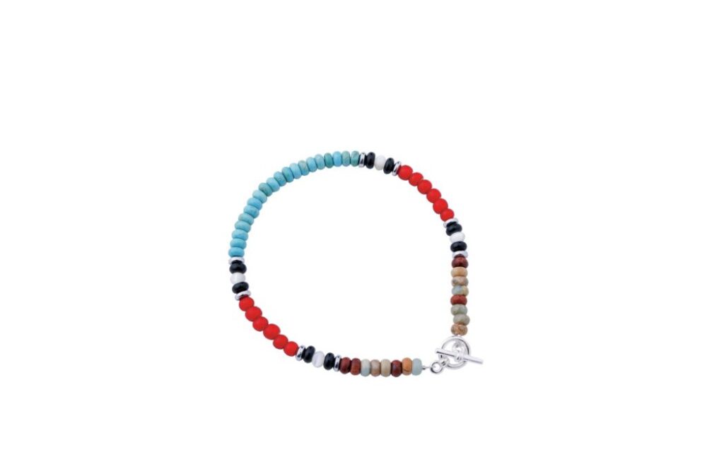 ターコイズやマグネサイト、シェルなど4mmの天然石とヴィンテージホワイトハーツのブレスレット。サントドミンゴ風の配色に、Tバー留め具がアクセント。1万1000円