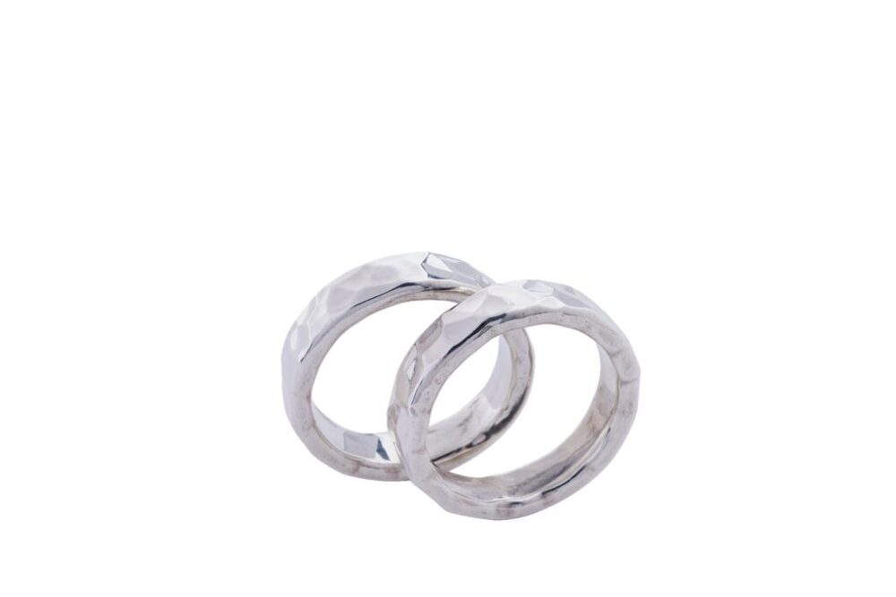 金鎚を使い、手作業で打ち込まれる凹凸の鎚目が魅力の2連リング。それぞれ別々の指にはめるも、同じ指につけるのも自由。あなたのスタイルに寄り添う逸品だ。4万9500円