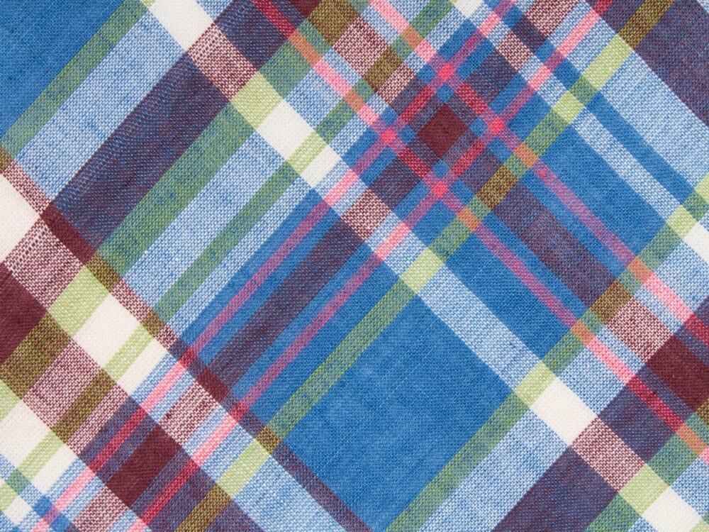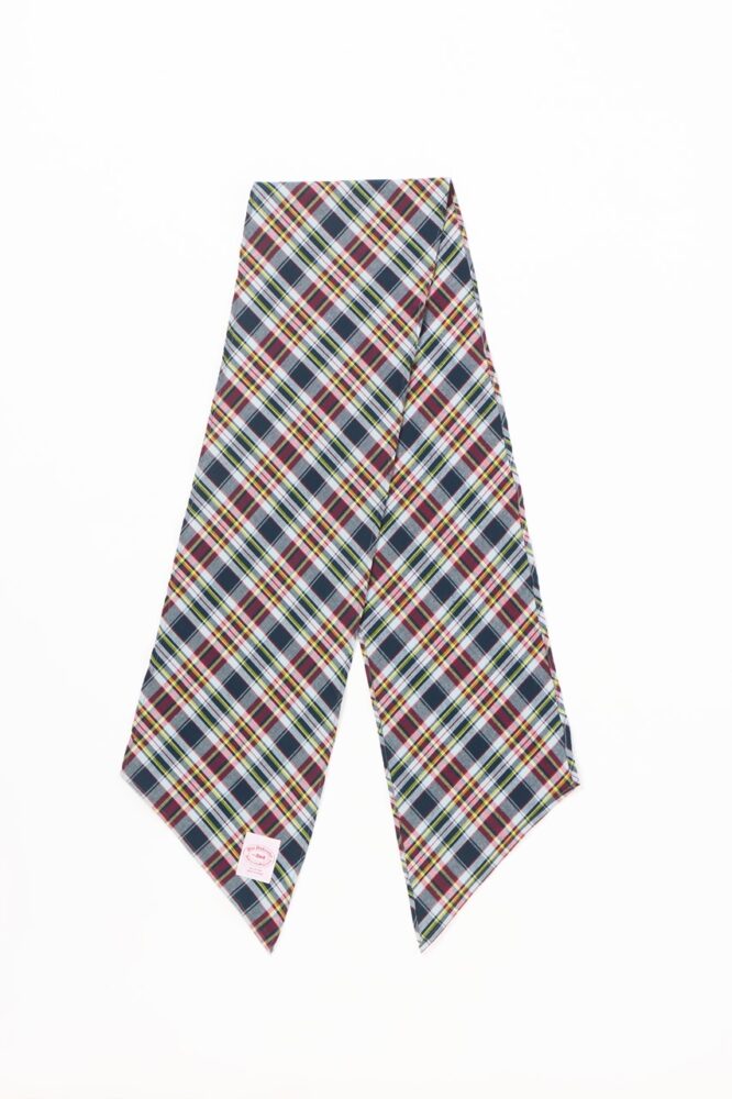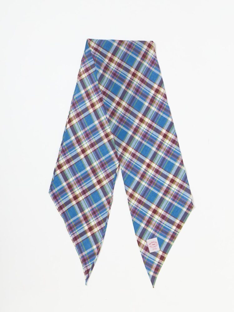 国内屈指のドレスシャツファクトリー「土井縫工所」とともに製作したシャツ生地のインディアンマドラスを贅沢に使用。1960年代頃のインドマドラスをイメージした粗野な風合いは残しつつ、夏らしい爽やかな配色で男女ともに使いやすい仕上がりとなりました。長さは約147cm(剣先から剣先までの長さ)で、程よいボリュームがあり、ネクタイのように巻くことも可能で、丸首のTシャツやスウェットシャツ、ポロシャツやボタンダウンシャツなど様々なトップスとの組み合わせることができる汎用性の高さも魅力です。夏はコーディネイトが単調になりがち。そこで、このスカーフを巻いて夏のトラッドスタイルを楽しみましょう!