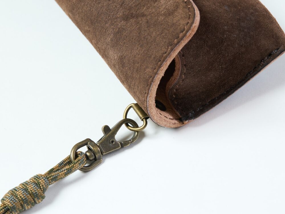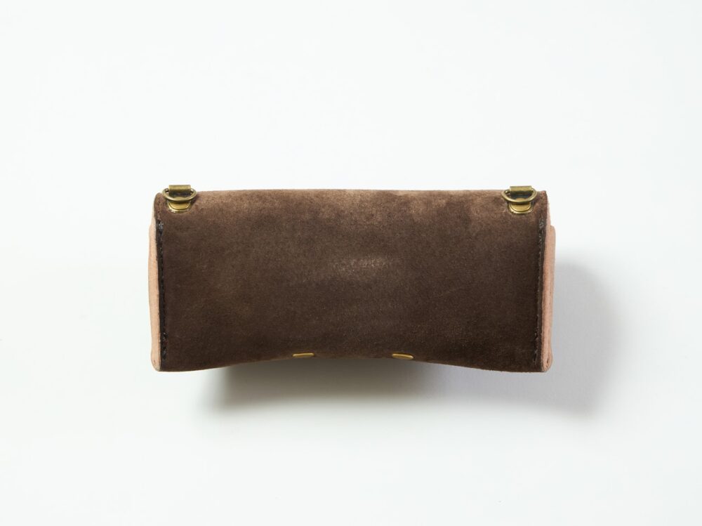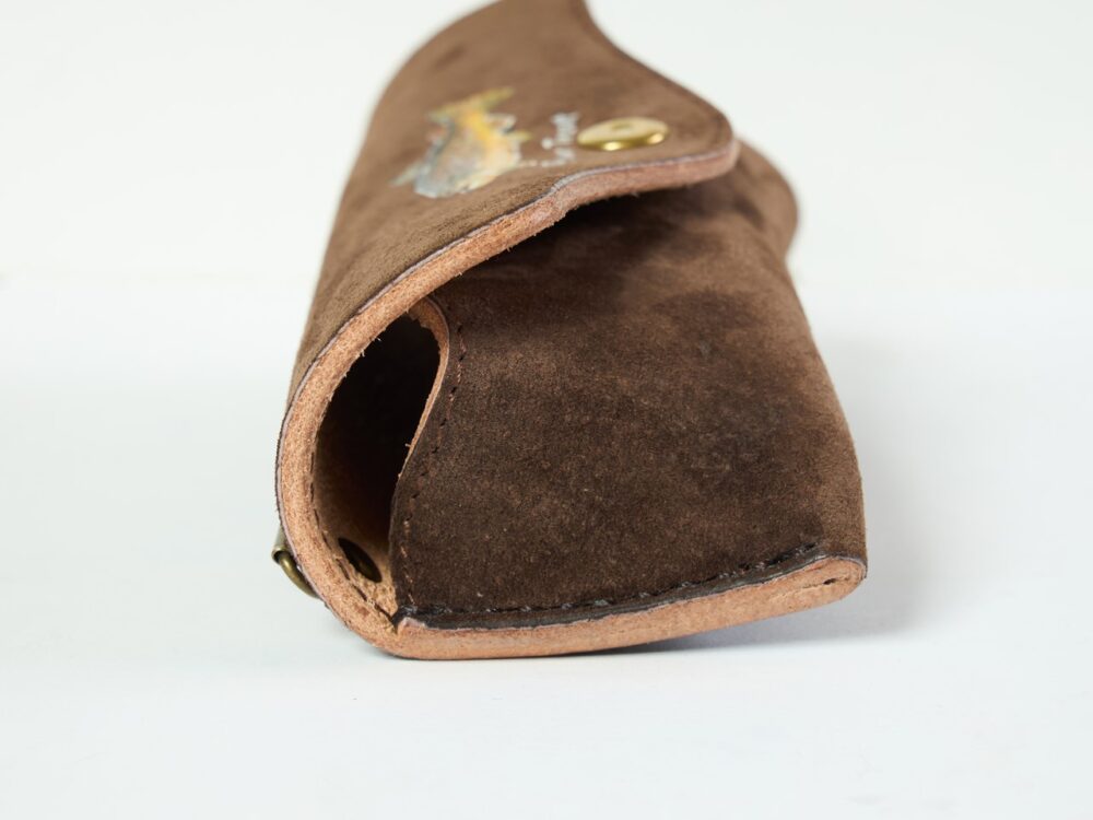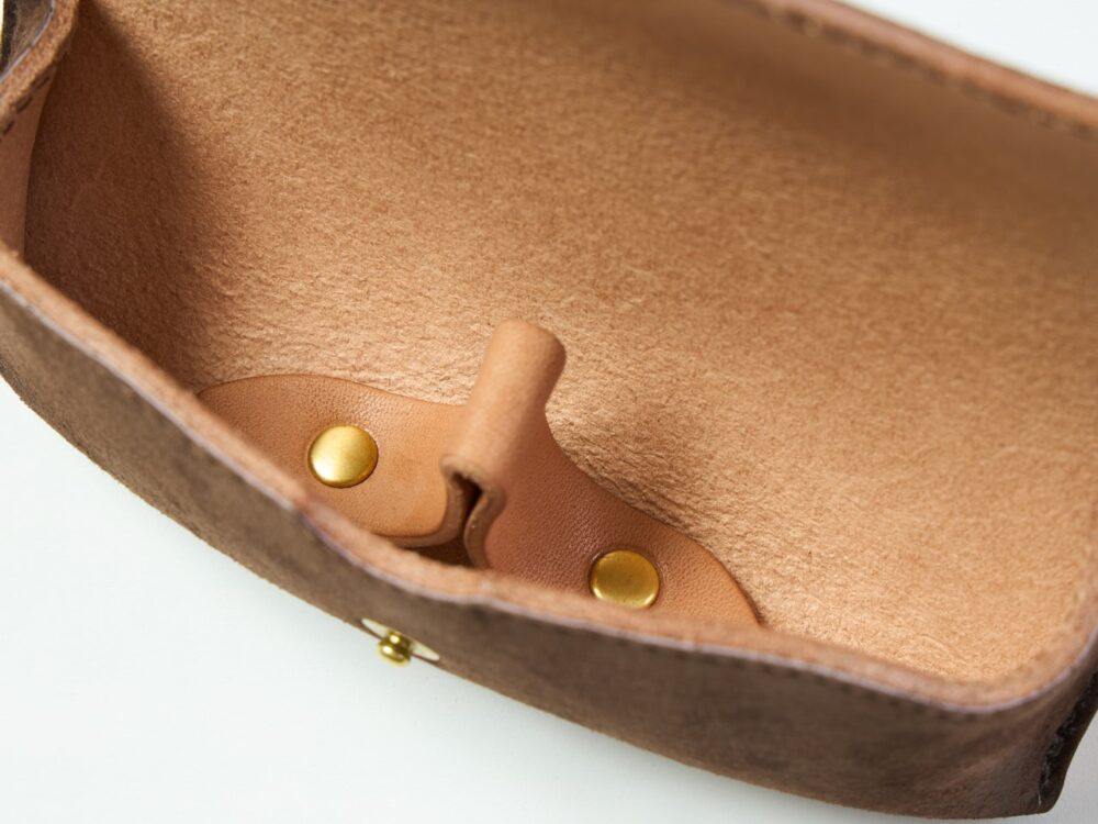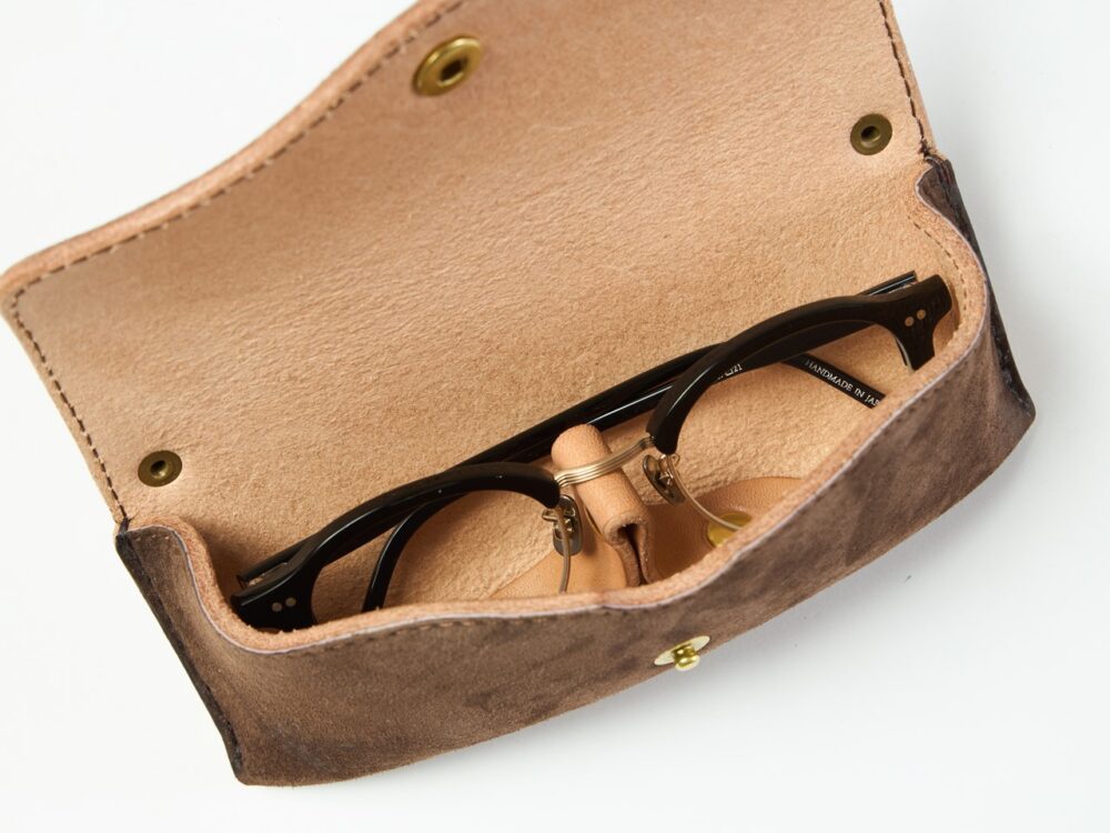 その柔らかさから通常メガネケースには用いられない、ピッグスウェードを使用。裏側に丈夫なレザーを貼り合わせることで、十分な保護性能を備えることが実現した。深みのあるブラウンカラーは、さまざまなスタイルとの相性も良く、アウトドアにもタウンユースにもなじむ万能さを備える。