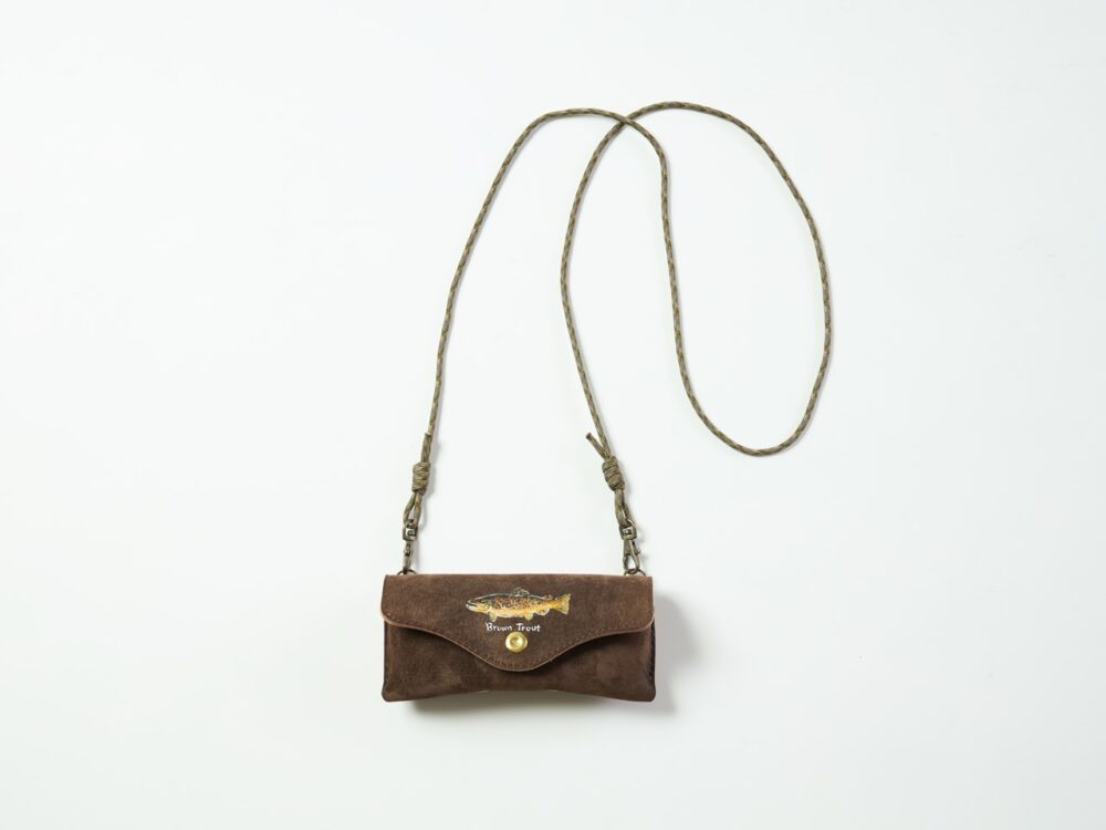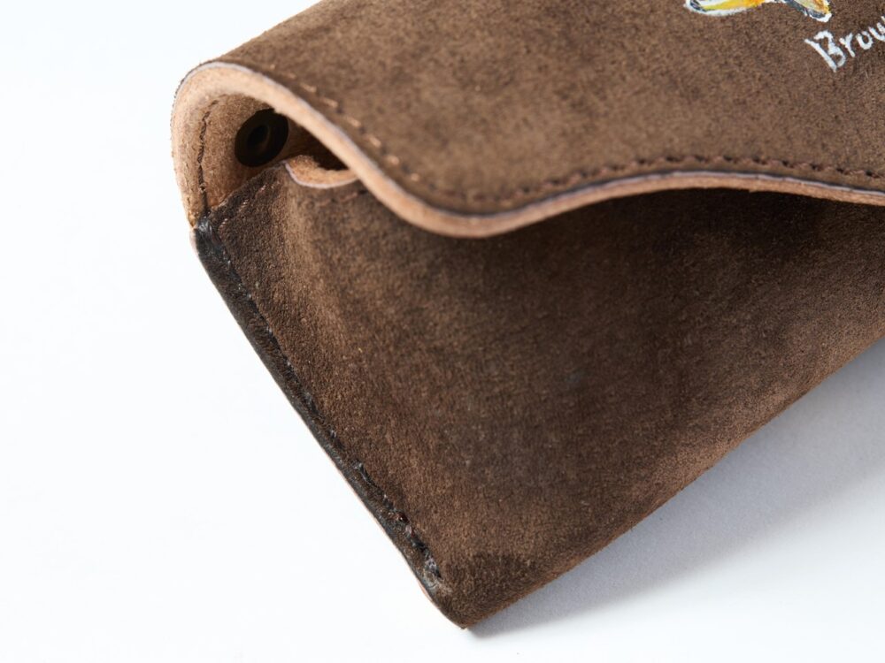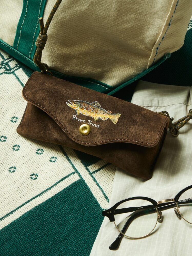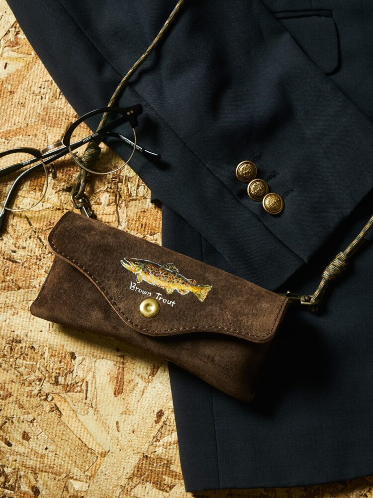 昨年、受注期間を待たずして完売となった「ブラウンブラウン」との別注。待望の第二弾は、7月号の特集「メガネとアメカジ。」に合わせて製作したメガネケースだ。今回もイラストレーターImaiさんによるハンドペイントを採用。前作同様、アウトドアモチーフをテーマに「ブラウントラウト」が丁寧に描かれている。素材には、やわらかなピッグスウェードに加え、内側には丈夫なレザーを貼り合わせて保護性を強化。背面にはDカンとパラコードを備え、首から下げられる仕様に。アクセサリー感覚でコーディネイトにも取り入れやすい。深みのあるブラウンカラーは、アウトドアからタウンユースまで幅広くマッチ。自然と都会、両方のフィールドで映える逸品に仕上がった。