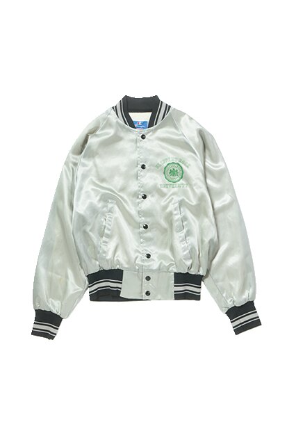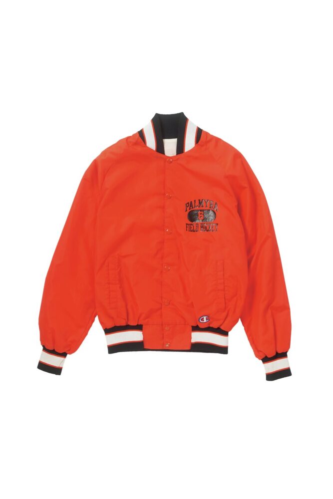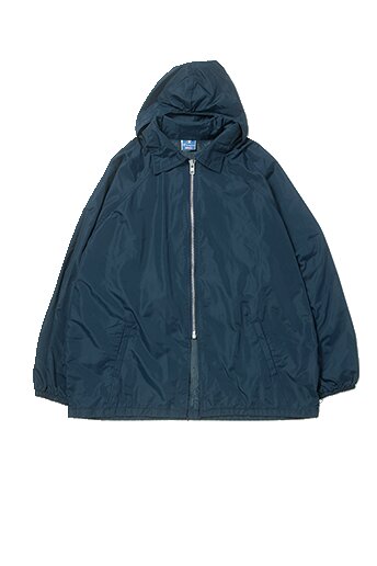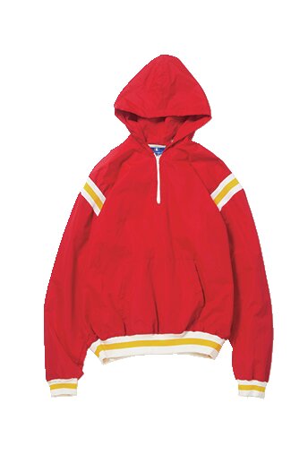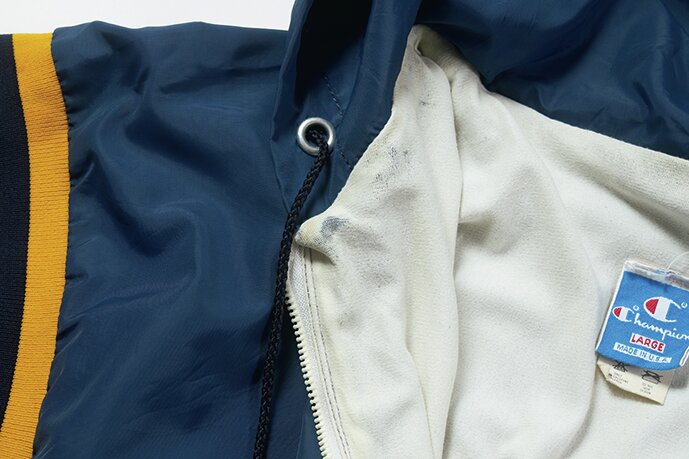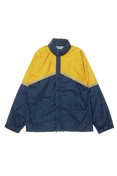 アスレチックウエアなので学校やチームで揃えたものが多く、その証がプリントや刺繍などで入る。スウェットやTシャツのプリントで人気のあるカプセル入り3段プリントもナイロンジャケットならお手頃価格。