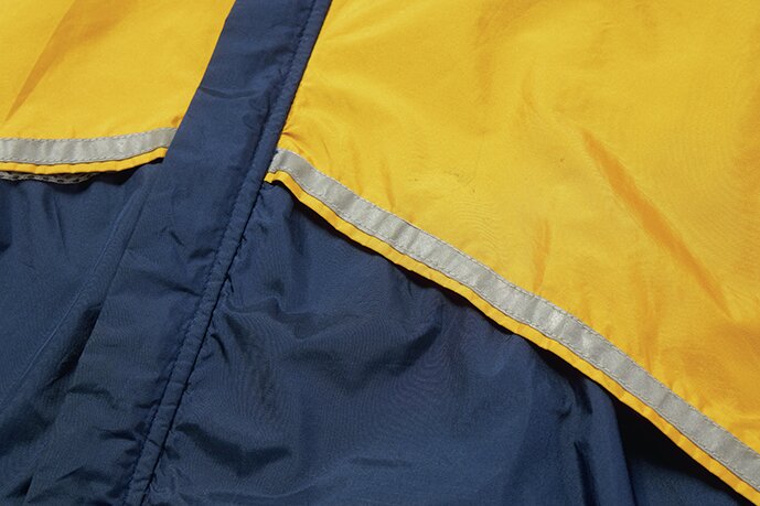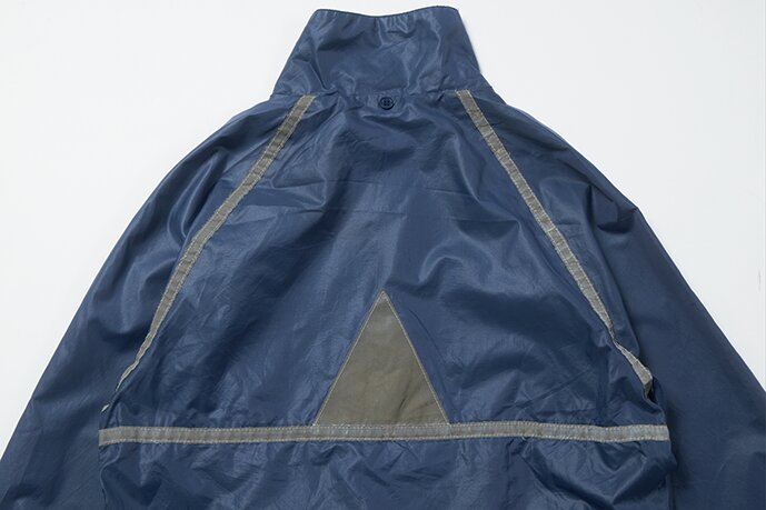 左は胸上と袖部分がイエローになっているため目を引くのに加え、ネイビーとの切り替え部分にリフレクターテープが施される。右は背中にある三角リフレクターに加え、胸上を囲うように三角形状にリフレクターテープが施される。どちらも周囲の光を反射して自分の存在を主張できるので、自転車やジョギング向けだと推測。