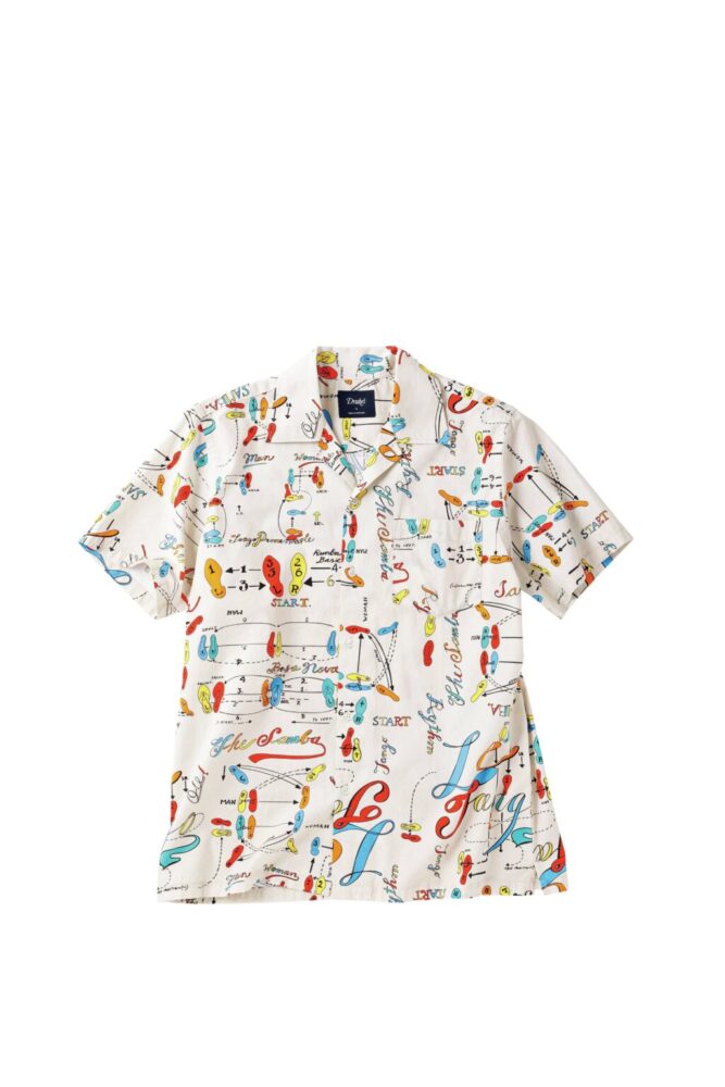 今回紹介するアイテムも春夏らしいカジュアルな開襟シャツ。よくスカーフに使われている“ダンスステップ”という柄も、その名の通りステップの解説図をそのまま柄に落とし込んでいて「ドレイクス」らしい軽妙さがあります。そんなブランドの代表的な柄を、開襟シャツにあしらうという「ユナイテッドアローズ」のナイス別注。