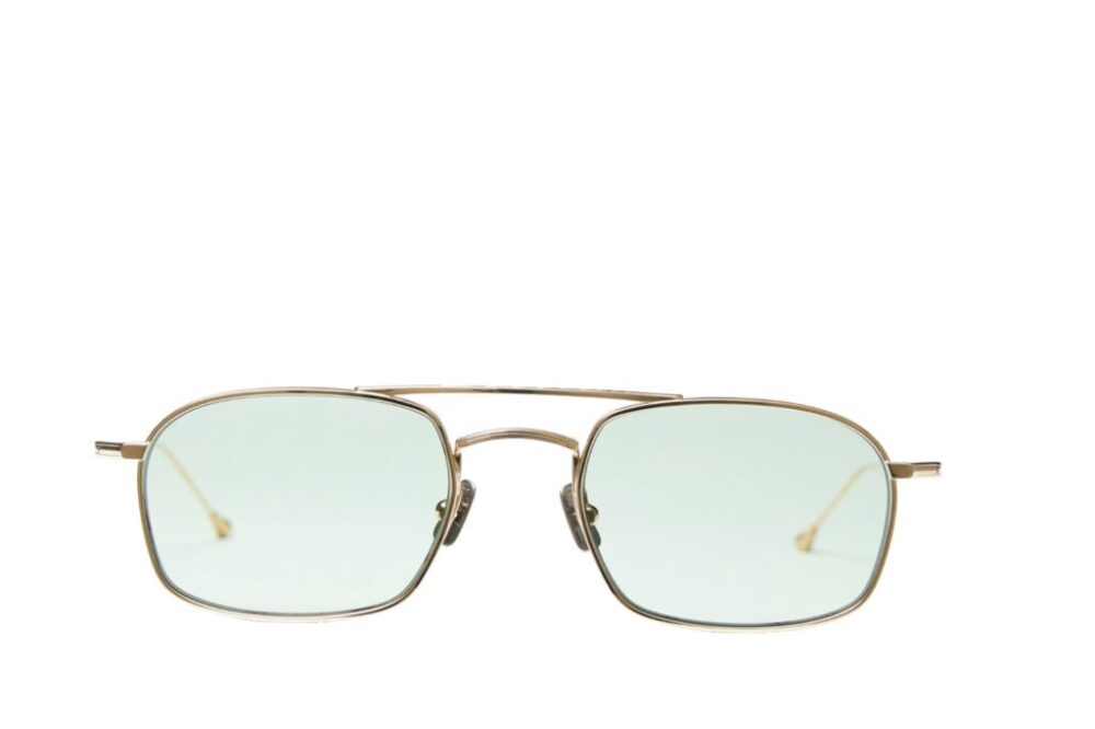 ダブルブリッジでは珍しい天地幅浅めのスクエアシェイプ。ゴールドのチタンフレームとグリーンのカラーレンズの相性もよく、総じてスタイリッシュな印象のモデル。6万6000円(パーツTEL06-6484-5323)