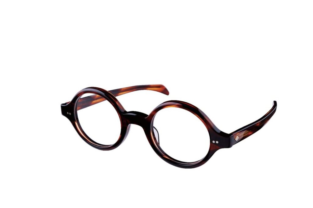 1950年代に存在したラウンドフレームを復刻。フロントはツードット、サイドはダイヤ型と、異なるカシメ飾りの組み合わせも個性的。着脱のしやすいストレートテンプルも魅力。4万7300円(プライベート アイズ アンド トラッカーズ TEL 070-1577-2666)