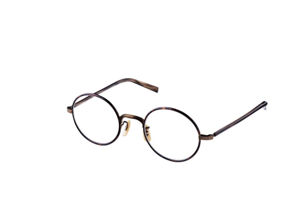 軽量かつ耐久性に優れたチタンフレームに、小ぶりなラウンドシェイプと彫金ブリッジを組み合わせ、周囲には七宝装飾を施した贅沢な一本。円筒型アセテートのテンプルが温かみのある優しい空気を漂わせる。4万6200円(ブロスジャパンTEL0778-52-7075)
