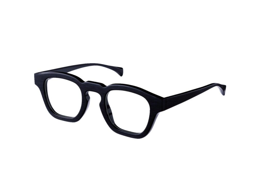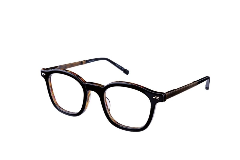 正面はシンプルな黒フレームながら、テンプルには精緻な彫金が施され、横顔にも個性を演出。層構造となっているフレームは角度によって表情を変え、多彩な印象を楽しむことができる。10万3400円(マツダアイウェアジャパン TEL 0776-43-9788)