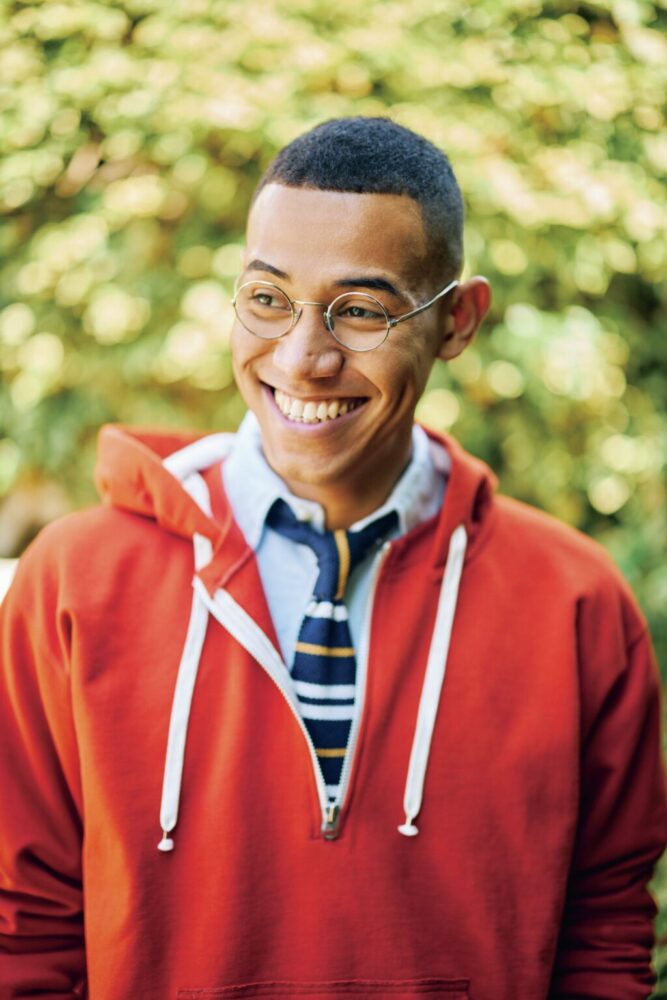 色もデザインもカジュアルなスウェットパーカには、思い切り上品なラウンドシェイプのメタルフレームを合わせる。旧きよきアメリカントラディショナルの世界から飛び出してきたようなカレッジスタイルの完成である。