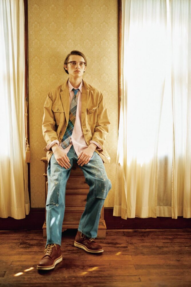 メガネを含む上半身がいつものトラッドスタイルであったとしてもペインターパンツを合わせるだけで実に新鮮に見える。たとえペイントが入っていても、ブーツを履いても、いまならむしろ心地いい。