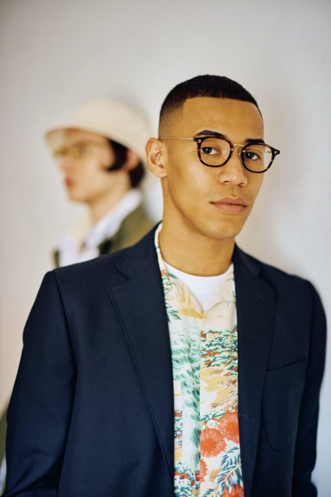 ブレザーのインナーといえばBDシャツが定石だが、アロハシャツに変えるだけでグンと新鮮に。カジュアルなスタイリングを引き締めるのは、ボストン型のコンビフレーム。