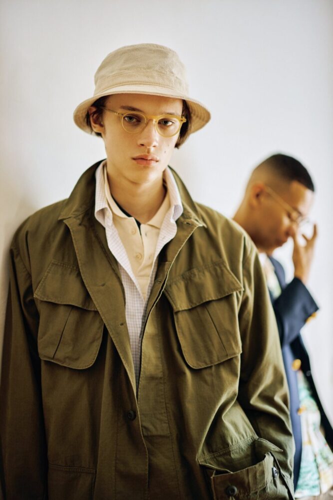 ミリタリーアイテムとトラッドスタイルの相性のよさは言わずもがな。ちなみにオリーブカラーのジャケットには、クリアイエローのセルフレームが抜群に合うこともお忘れなく。
