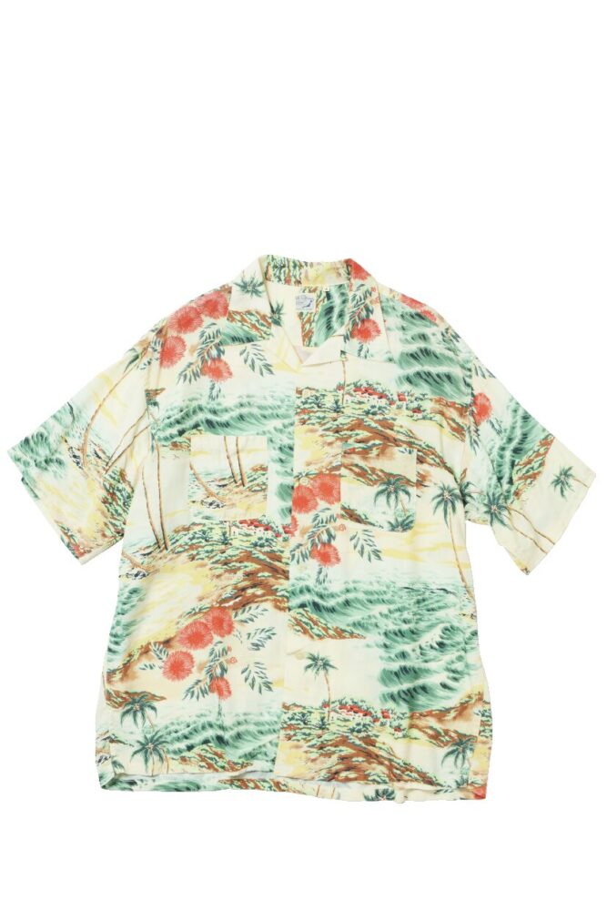 アロハシャツ定番の「ホライゾン」と「オールオーバー」パターンを組み合わせた、どこか和の風情も感じる柄。レーヨン生地。2万9700円(ベースデニムプロダクツTEL0798ー74-8106)