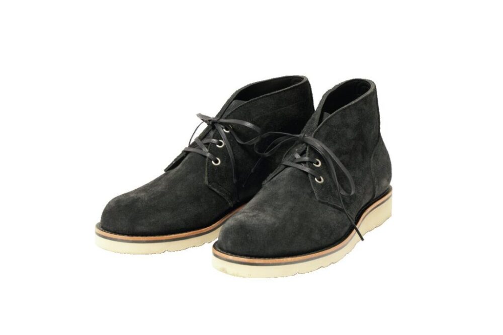 肉厚で毛並みの柔らかい高品質の銀付きスウェードを採用したチャッカブーツ。ヒールライニングを排除することによって、履き心地を向上させた。6万6000円(ザ ジン フットウェア クラブTEL03-5830-3102)