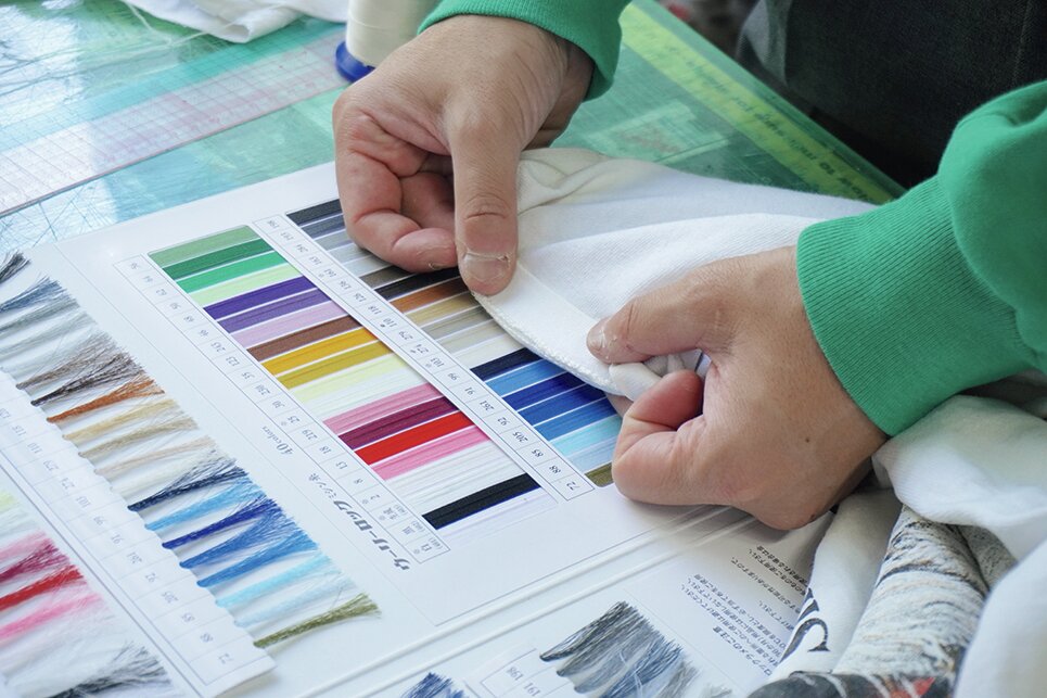 縫い糸を決める作業はとても大切。元々使われている糸、そのアイテムの別の場所で縫われている箇所と見比べながら、1番近いものを選ぶ。